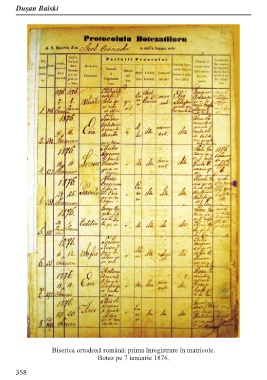 Dușan Baiski Biserica ortodoxă română: prima înregistrare în matricole. Botez pe 7 ianuarie 1876. 358