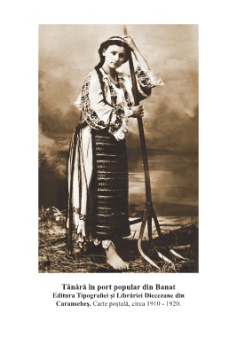 Tânără în port popular din Banat Editura Tipografiei şi Librăriei Diecezane din Caransebeş. Carte poştală, circa 1910 - 1920.