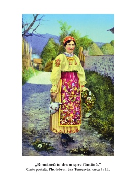 „Româncă în drum spre fântână.” Carte poştală, Photobromüra Temesvár, circa 1915.