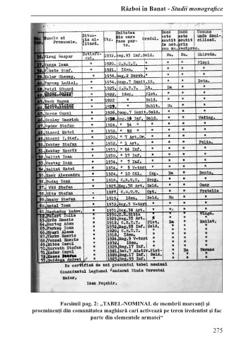 Război în Banat - Studii monografice Facsimil pag. 2: „TABEL-NOMINAL de membrii marcanți și proeminenți din comunitatea maghiară cari activează pe teren iredentist și fac parte din elementele armatei“ 275