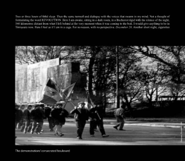 care îi dictam lui Sandu textele pentru manifeste şi când el se prăpădea de râs, fabulând în timp ce le scria pe bucăţi de carton cu   formulating the word REVOLUTION. Here I am awake, sitting in a dark room, in a Bucharest rigid with the silence of the night,