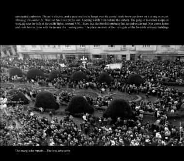 coloană de demonstranţi. De pe trotuar li se strigă: “Provocatorilor!” Ajungem pe o străduţă perpendiculară pe intrarea ambasadei Morning. December 21. Wait for Nae’s telephone call. Keeping watch from behind the curtain. The gang of workmen keeps on