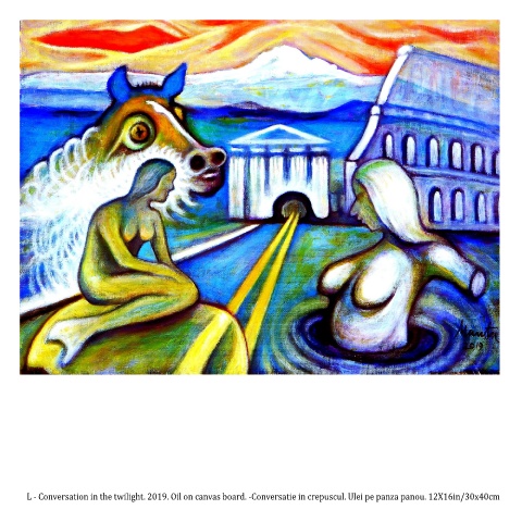 L - Conversation in the twilight. 2019. Oil on canvas board. -Conversatie in crepuscul. Ulei pe panza panou. 12X16in/30x40cm
