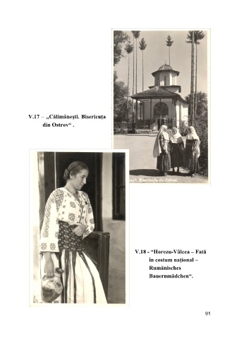 V.17 – „Călimăneşti. Bisericuţa din Ostrov“ . V.18 - “Horezu-Vâlcea – Fată în costum naţional – Rumänisches Bauernmädchen“. 91