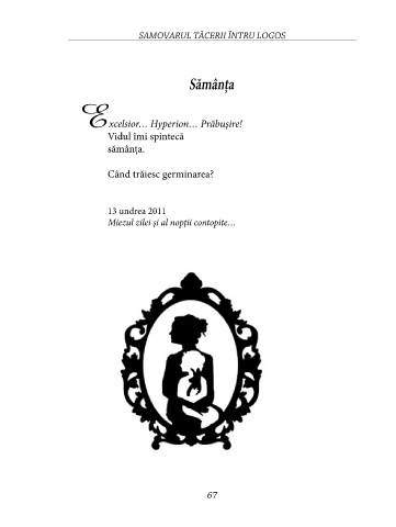 SAMOVARUL TĂCERII înTRU LOGOS Sămânţa Excelsior… Hyperion… Prăbuşire! Vidul îmi spintecă sămânţa. Când trăiesc germinarea? 13 undrea 2011 Miezul zilei şi al nopţii contopite… 67