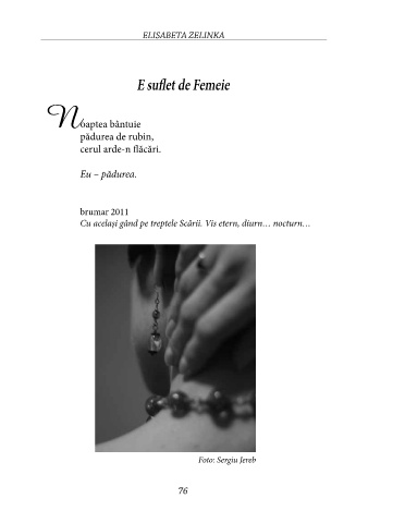 ELISABETA ZELInKA E suflet de Femeie Noaptea bântuie pădurea de rubin, cerul arde-n flăcări. Eu – pădurea. brumar 2011 Cu acelaşi gând pe treptele Scării. Vis etern, diurn… nocturn… Foto: Sergiu Jereb 76