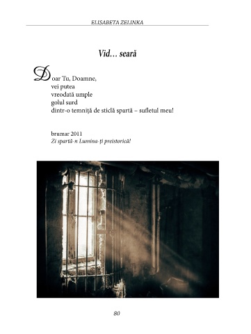 ELISABETA ZELInKA Vid… seară Doar Tu, Doamne, vei putea vreodată umple golul surd dintr-o temniţă de sticlă spartă – sufletul meu! brumar 2011 Zi spartă-n Lumina-ţi preistorică! 80