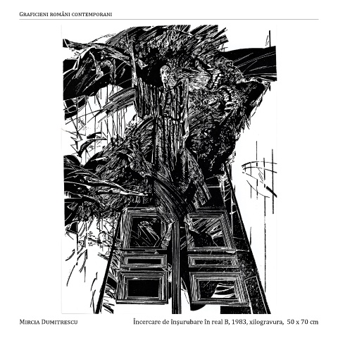 Graficieni români contemporani Mircia Dumitrescu Încercare de înșurubare în real B, 1983, xilogravura, 50 x 70 cm