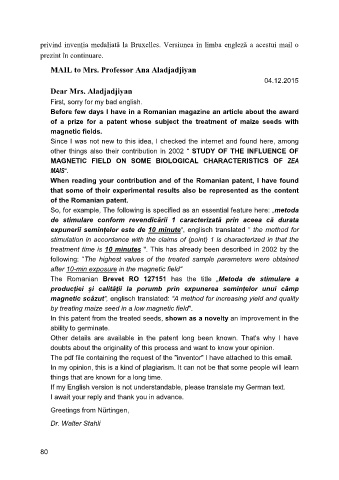 privind invenţia medaliată la Bruxelles. Versiunea în limba engleză a acestui mail o