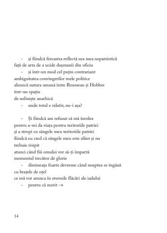 14-%u0219i fiindc%u0103 fereastra reflect%u0103 ura mea nepatriotic%u0103fa%u021b%u0103 de arta de a ucide du%u0219manii din oficiu -%u0219i %u00eentr-un mod cel pu%u021bin contrariantambiguitatea convingerilor mele politicealunec%u0103 natura uman%u0103 %u00eentre Rousseau %u0219i Hobbes%u00eentr-un spa%u021biude nelini%u0219te anarhic%u0103-unde totul e relativ, nu-i a%u0219a?%u0218i fiindc%u0103 am refuzat s%u0103 m%u0103 %u00eenrolezpentru a-mi da via%u021ba pentru teritoriile patriei%u0219i a stropi cu s%u00e2ngele meu teritoriile patrieifiindc%u0103 eu cred c%u0103 s%u00e2ngele meu este sf%u00e2nt %u0219i nu trebuie risipit atunci c%u00e2nd fiii omului vor s%u0103-%u021bi %u00eempart%u0103momentul trec%u0103tor de glorie-diminea%u021ba foarte devreme c%u00e2nd noaptea se %u00eeng%u00e2n%u0103 cu bra%u021bele de o%u021bel ce m%u0103 vor arunca %u00een eternele fl%u0103c%u0103ri ale iadului-pentru c%u0103 merit %u2192