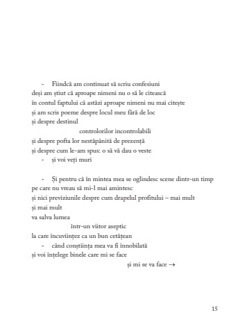 -Fiindc%u0103 am continuat s%u0103 scriu confesiunide%u0219i am %u0219tiut c%u0103 aproape nimeni nu o s%u0103 le citeasc%u0103%u00een contul faptului c%u0103 ast%u0103zi aproape nimeni nu mai cite%u0219te%u0219i am scris poeme despre locul meu f%u0103r%u0103 de loc%u0219i despre destinul controlorilor incontrolabili%u0219i despre pofta lor nest%u0103p%u00e2nit%u0103 de prezen%u021b%u0103%u0219i despre cum le-am spus: o s%u0103 v%u0103 dau o veste-%u0219i voi ve%u021bi muripe care nu vreau s%u0103 mi-l mai amintesc%u0219i nici previziunile despre cum drapelul profitului %u2013 mai mult %u0219i mai mult va salva lumea %u00eentr-un viitor asepticla care %u00eencuviin%u021bez ca un bun cet%u0103%u021bean-c%u00e2nd con%u0219tiin%u021ba mea va fi %u00eennobilat%u0103%u0219i voi %u00een%u021belege binele care mi se face %u0219i mi se va face %u2192