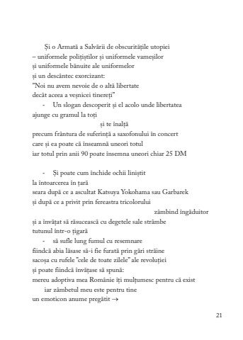 %u0218i o Armat%u0103 a Salv%u0103rii de obscurit%u0103%u021bile utopiei %u2013 uniformele poli%u021bi%u0219tilor %u0219i uniformele vame%u0219ilor %u0219i uniformele b%u0103nuite ale uniformelor %u0219i un desc%u00e2ntec exorcizant: %u201dNoi nu avem nevoie de o alt%u0103 libertate dec%u00e2t aceea a ve%u0219nicei tinere%u021bi%u201d -Un slogan descoperit %u0219i el acolo unde libertateaajunge cu gramul la to%u021bi %u0219i te %u00eenal%u021b%u0103precum fr%u00e2ntura de suferin%u021b%u0103 a saxofonului %u00een concert care %u0219i ea poate c%u0103 %u00eenseamn%u0103 uneori totuliar totul prin anii 90 poate %u00eensemna uneori chiar 25 DM-%u0218i poate cum %u00eenchide ochii lini%u0219tit la %u00eentoarcerea %u00een %u021bar%u0103 seara dup%u0103 ce a ascultat Katsuya Yokohama sau Garbarek%u0219i dup%u0103 ce a privit prin fereastra tricolorului z%u00e2mbind %u00eeng%u0103duitor%u0219i a %u00eenv%u0103%u021bat s%u0103 r%u0103suceasc%u0103 cu degetele sale str%u00e2mbe tutunul %u00eentr-o %u021bigar%u0103-s%u0103 sufle lung fumul cu resemnarefiindc%u0103 abia l%u0103sase s%u0103-i fie furat%u0103 prin g%u0103ri str%u0103inesaco%u0219a cu rufele %u201dcele de toate zilele%u201d ale revolu%u021biei%u0219i poate fiindc%u0103 %u00eenv%u0103%u021base s%u0103 spun%u0103: mereu adoptiva mea Rom%u00e2nie %u00ee%u021bi mul%u021bumesc pentru c%u0103 exist iar z%u00e2mbetul meu este pentru tineun emoticon anume preg%u0103tit %u2192