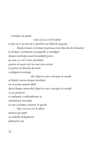 22 - %u00eenv%u0103%u021base s%u0103 spun%u0103 - %u0219tiu c%u0103 %u0219i eu voi fi salvat%u0219i %u0219tiu c%u0103 n-a%u0219 vrea s%u0103 te pierd %u00een tot felul de angoase-fiindc%u0103 %u00eentors %u0219i %u00eenv%u0103%u021bat s%u0103 priveasc%u0103 de dincolo de fereastr%u0103%u0219i %u00eenv%u0103%u021bat o iert%u0103toare scenografie a nostalgieidespre motiva%u021bia unui formidabil poem pe care n-o s%u0103-l scrie niciodat%u0103pentru c%u0103 acum nici nu mai este nevoie%u0219i pentru c%u0103 dincolo de toatea %u00eenf%u0103ptuit revolu%u021bia din clipa %u00een care a %u00eenceput s%u0103 cread%u0103%u0219i fiindc%u0103 mereu despre revolu%u021bienu se poate aminti altfeldec%u00e2t despre miracolul clipei %u00een care a %u00eenceput s%u0103 cread%u0103ca un penitentce isp%u0103%u0219e%u0219te o nelini%u0219titoare %u0219i ne%u00een%u021beleas%u0103 vinov%u0103%u021bie%u0219i care a %u00eenv%u0103%u021bat cuminte s%u0103 spun%u0103:-%u0218tiu c%u0103 %u0219i eu voi fi salvataruncat pe spatecu m%u00e2inile %u00eendep%u0103rtate plutind %u00een aer