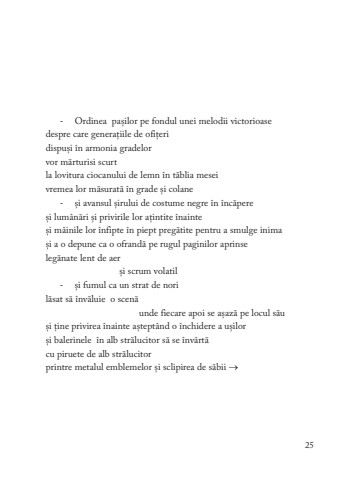 -Ordinea pa%u0219ilor pe fondul unei melodii victorioasedespre care genera%u021biile de ofi%u021beri dispu%u0219i %u00een armonia gradelorvor m%u0103rturisi scurt la lovitura ciocanului de lemn %u00een t%u0103blia meseivremea lor m%u0103surat%u0103 %u00een grade %u0219i colane-%u0219i avansul %u0219irului de costume negre %u00een %u00eenc%u0103pere%u0219i lum%u00e2n%u0103ri %u0219i privirile lor a%u021bintite %u00eenainte%u0219i m%u00e2inile lor %u00eenfipte %u00een piept preg%u0103tite pentru a smulge inima %u0219i a o depune ca o ofrand%u0103 pe rugul paginilor aprinse leg%u0103nate lent de aer %u0219i scrum volatil-%u0219i fumul ca un strat de nori l%u0103sat s%u0103 %u00eenv%u0103luie o scen%u0103 unde fiecare apoi se a%u0219az%u0103 pe locul s%u0103u %u0219i %u021bine privirea %u00eenainte a%u0219tept%u00e2nd o %u00eenchidere a u%u0219ilor%u0219i balerinele %u00een alb str%u0103lucitor s%u0103 se %u00eenv%u00e2rt%u0103 cu piruete de alb str%u0103lucitorprintre metalul emblemelor %u0219i sclipirea de s%u0103bii %u2192