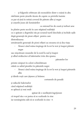 -%u0219i fulgerele orbitoare ale monedelor dintr-o m%u00e2n%u0103 %u00een altar%u0103sfr%u00e2nte peste %u0219irurile t%u0103cute de capete cu privirile %u00eenaintece par s%u0103 %u021bin%u0103 %u00een retin%u0103 covorul de p%u0103trate albe %u0219i negre%u0219i ce%u021burile joase ale lum%u00e2n%u0103rilor cu mirosul lor de cear%u0103 %u0219i ierburi arse%u00een plutire peste secole %u00een care st%u0103p%u00e2nul realit%u0103%u021biicu o ap%u0103sare a degetului s%u0103u pe ecranul tactil deschide %u0219i %u00eenchide u%u0219iledup%u0103 genera%u021bii de pioni ofi%u021beri pentru caredintotdeaunaurm%u0103toarele genera%u021bii de pioni ofi%u021beri au onoarea s%u0103-%u0219i dea via%u021ba-Atunci c%u00e2nd m%u00e2na %u00eempinge de la est la vest %u0219i %u00eenapoi p%u0103trate negre sau mi%u0219c%u0103toare meandre de la nord la sud %u0219i %u00eenapoi%u0219i albul str%u0103lucitor al balerinelor ivite din spuma p%u0103tratelor lorodat%u0103 cu saltul pionilor %u00een p%u0103tratele negre -Atunci c%u00e2nd m%u00e2na %u00eempinge de la est la vest %u0219i %u00eenapoi p%u0103tratele albe%u0219i d%u00e2rele ro%u0219ii care %u021b%u00e2%u0219nesc %u0219i hr%u0103nesc costumele de parad%u0103%u0219i n%u0103lucile balerinelorc%u00e2nd st%u0103p%u00e2nul realit%u0103%u021biise apleac%u0103 %u0219i mai mult ap%u0103sat de o nesf%u00e2r%u0219it%u0103 %u00eengrijorarec%u0103 trupul s%u0103u s-ar putea s%u0103 se scufunde %u00een sineiar nem%u0103rginita sal%u0103 s%u0103 se scufunde %u00een sine%u2192