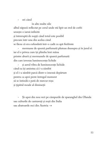 -ori c%u00e2nd %u00een alte multe zilealbul z%u0103pezii reflectat pe cerul unde st%u0103 lipit un stol de corbiurze%u0219te o iarn%u0103 infinit%u0103%u0219i %u00eentrerupt%u0103 de nop%u021bi c%u00e2nd totul este posibilprecum %u00eentr-una din acelea c%u00e2ndse f%u0103cea c%u0103 era cufundat%u0103 %u00eentr-o cad%u0103 cu ap%u0103 fierbinte-mormane de spum%u0103 parfumat%u0103 pluteau deasupra %u0219i %u00een jurul eiiar el o privea cum %u00ee%u0219i plimba lent m%u00e2na printre aburii %u0219i mormanele de spum%u0103 parfumat%u0103din care izvorau luminescen%u021be lichide-%u0219i aerul vibra de luminescen%u021be lichidec%u00e2nd ea %u00ee%u0219i amintea c%u0103 i-a z%u00e2mbit%u0219i el i-a z%u00e2mbit parc%u0103 dintr-o imens%u0103 dep%u0103rtarepentru ca apoi peste %u00eentregul moment s%u0103 se %u00eentind%u0103 o pat%u0103 de mercur ro%u0219u%u0219i %u021bip%u0103tul moale al dimine%u021bii-%u0218i-apoi din nou veri pe c%u00e2mpurile de sparanghel din Olandasau culturile de castrave%u021bi %u0219i ro%u0219ii din Italiasau abatoarele reci din Austria %u2192