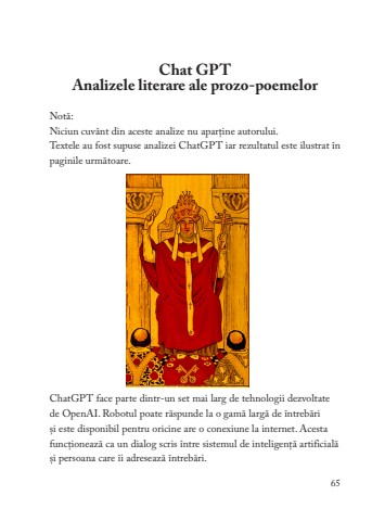 Chat GPT Analizele literare ale prozo-poemelorNot%u0103:Niciun cuv%u00e2nt din aceste analize nu apar%u021bine autorului.Textele au fost supuse analizei ChatGPT iar rezultatul este ilustrat %u00een paginile urm%u0103toare. ChatGPT face parte dintr-un set mai larg de tehnologii dezvoltate de OpenAI. Robotul poate r%u0103spunde la o gam%u0103 larg%u0103 de %u00eentreb%u0103ri %u0219i este disponibil pentru oricine are o conexiune la internet. Acesta func%u021bioneaz%u0103 ca un dialog scris %u00eentre sistemul de inteligen%u021b%u0103 artificial%u0103 %u0219i persoana care %u00eei adreseaz%u0103 %u00eentreb%u0103ri.