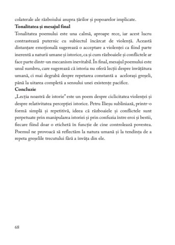 68colaterale ale r%u0103zboiului asupra %u021b%u0103rilor %u0219i popoarelor implicate.Tonalitatea %u0219i mesajul finalTonalitatea poemului este una calm%u0103, aproape rece, iar acest lucru contrasteaz%u0103 puternic cu subiectul %u00eenc%u0103rcat de violen%u021b%u0103. Aceast%u0103 distan%u021bare emo%u021bional%u0103 sugereaz%u0103 o acceptare a violen%u021bei ca fiind parte inerent%u0103 a naturii umane %u0219i istorice, ca %u0219i cum r%u0103zboaiele %u0219i conflictele ar face parte dintr-un mecanism inevitabil. %u00cen final, mesajul poemului este unul sumbru, care sugereaz%u0103 c%u0103 istoria nu ofer%u0103 lec%u021bii despre %u00eenv%u0103%u021b%u0103tura uman%u0103, ci mai degrab%u0103 despre repetarea constant%u0103 a acelora%u0219i gre%u0219eli, p%u00e2n%u0103 la uitarea complet%u0103 a sensului unei existen%u021be pacifice.Concluzie%u201eLec%u021bia noastr%u0103 de istorie%u201d este un poem despre ciclicitatea violen%u021bei %u0219i despre relativitatea percep%u021biei istorice. Petru Ilie%u0219u subliniaz%u0103, printr-o form%u0103 simpl%u0103 %u0219i repetitiv%u0103, ideea c%u0103 r%u0103zboaiele %u0219i conflictele sunt perpetuate prin manipularea istoriei %u0219i prin confuzia %u00eentre eroi %u0219i bestii, fiecare fiind doar o etichet%u0103 %u00een func%u021bie de cine controleaz%u0103 povestea. Poemul ne provoac%u0103 s%u0103 reflect%u0103m la natura uman%u0103 %u0219i la tendin%u021ba de a repeta gre%u0219elile trecutului f%u0103r%u0103 a %u00eenv%u0103%u021ba din ele.