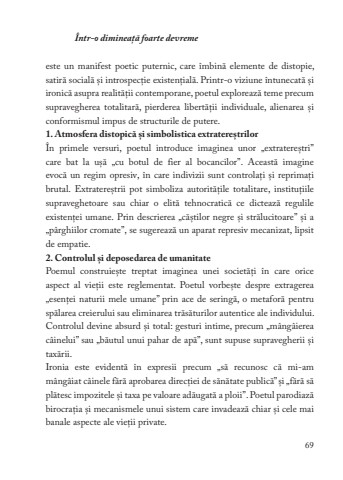 %u00centr-o diminea%u021b%u0103 foarte devremeeste un manifest poetic puternic, care %u00eembin%u0103 elemente de distopie, satir%u0103 social%u0103 %u0219i introspec%u021bie existen%u021bial%u0103. Printr-o viziune %u00eentunecat%u0103 %u0219i ironic%u0103 asupra realit%u0103%u021bii contemporane, poetul exploreaz%u0103 teme precum supravegherea totalitar%u0103, pierderea libert%u0103%u021bii individuale, alienarea %u0219i conformismul impus de structurile de putere.1. Atmosfera distopic%u0103 %u0219i simbolistica extratere%u0219trilor%u00cen primele versuri, poetul introduce imaginea unor %u201eextratere%u0219tri%u201d care bat la u%u0219%u0103 %u201ecu botul de fier al bocancilor%u201d. Aceast%u0103 imagine evoc%u0103 un regim opresiv, %u00een care indivizii sunt controla%u021bi %u0219i reprima%u021bi brutal. Extratere%u0219trii pot simboliza autorit%u0103%u021bile totalitare, institu%u021biile supraveghetoare sau chiar o elit%u0103 tehnocratic%u0103 ce dicteaz%u0103 regulile existen%u021bei umane. Prin descrierea %u201ec%u0103%u0219tilor negre %u0219i str%u0103lucitoare%u201d %u0219i a %u201ep%u00e2rghiilor cromate%u201d, se sugereaz%u0103 un aparat represiv mecanizat, lipsit de empatie.2. Controlul %u0219i deposedarea de umanitatePoemul construie%u0219te treptat imaginea unei societ%u0103%u021bi %u00een care orice aspect al vie%u021bii este reglementat. Poetul vorbe%u0219te despre extragerea %u201eesen%u021bei naturii mele umane%u201d prin ace de sering%u0103, o metafor%u0103 pentru sp%u0103larea creierului sau eliminarea tr%u0103s%u0103turilor autentice ale individului. Controlul devine absurd %u0219i total: gesturi intime, precum %u201em%u00e2ng%u00e2ierea c%u00e2inelui%u201d sau %u201eb%u0103utul unui pahar de ap%u0103%u201d, sunt supuse supravegherii %u0219i tax%u0103rii.Ironia este evident%u0103 %u00een expresii precum %u201es%u0103 recunosc c%u0103 mi-am m%u00e2ng%u00e2iat c%u00e2inele f%u0103r%u0103 aprobarea direc%u021biei de s%u0103n%u0103tate public%u0103%u201d %u0219i %u201ef%u0103r%u0103 s%u0103 pl%u0103tesc impozitele %u0219i taxa pe valoare ad%u0103ugat%u0103 a ploii%u201d. Poetul parodiaz%u0103 birocra%u021bia %u0219i mecanismele unui sistem care invadeaz%u0103 chiar %u0219i cele mai banale aspecte ale vie%u021bii private.