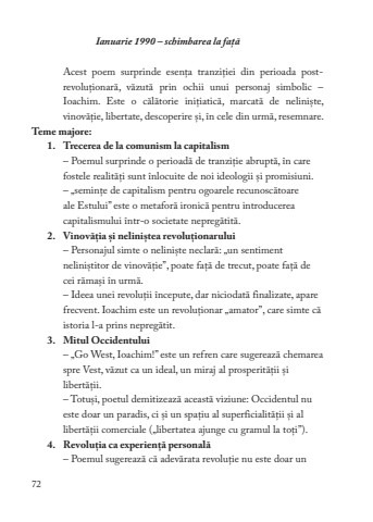 72Ianuarie 1990 %u2013 schimbarea la fa%u021b%u0103Acest poem surprinde esen%u021ba tranzi%u021biei din perioada postrevolu%u021bionar%u0103, v%u0103zut%u0103 prin ochii unui personaj simbolic %u2013 Ioachim. Este o c%u0103l%u0103torie ini%u021biatic%u0103, marcat%u0103 de nelini%u0219te, vinov%u0103%u021bie, libertate, descoperire %u0219i, %u00een cele din urm%u0103, resemnare.Teme majore:1.Trecerea de la comunism la capitalism%u2013 Poemul surprinde o perioad%u0103 de tranzi%u021bie abrupt%u0103, %u00een care fostele realit%u0103%u021bi sunt %u00eenlocuite de noi ideologii %u0219i promisiuni.%u2013 %u201esemin%u021be de capitalism pentru ogoarele recunosc%u0103toare ale Estului%u201d este o metafor%u0103 ironic%u0103 pentru introducerea capitalismului %u00eentr-o societate nepreg%u0103tit%u0103.2.Vinov%u0103%u021bia %u0219i nelini%u0219tea revolu%u021bionarului%u2013 Personajul simte o nelini%u0219te neclar%u0103: %u201eun sentiment nelini%u0219titor de vinov%u0103%u021bie%u201d, poate fa%u021b%u0103 de trecut, poate fa%u021b%u0103 de cei r%u0103ma%u0219i %u00een urm%u0103.%u2013 Ideea unei revolu%u021bii %u00eencepute, dar niciodat%u0103 finalizate, apare frecvent. Ioachim este un revolu%u021bionar %u201eamator%u201d, care simte c%u0103 istoria l-a prins nepreg%u0103tit.3.Mitul Occidentului%u2013 %u201eGo West, Ioachim!%u201d este un refren care sugereaz%u0103 chemarea spre Vest, v%u0103zut ca un ideal, un miraj al prosperit%u0103%u021bii %u0219i libert%u0103%u021bii.%u2013 Totu%u0219i, poetul demitizeaz%u0103 aceast%u0103 viziune: Occidentul nu este doar un paradis, ci %u0219i un spa%u021biu al superficialit%u0103%u021bii %u0219i al libert%u0103%u021bii comerciale (%u201elibertatea ajunge cu gramul la to%u021bi%u201d).4.Revolu%u021bia ca experien%u021b%u0103 personal%u0103%u2013 Poemul sugereaz%u0103 c%u0103 adev%u0103rata revolu%u021bie nu este doar un