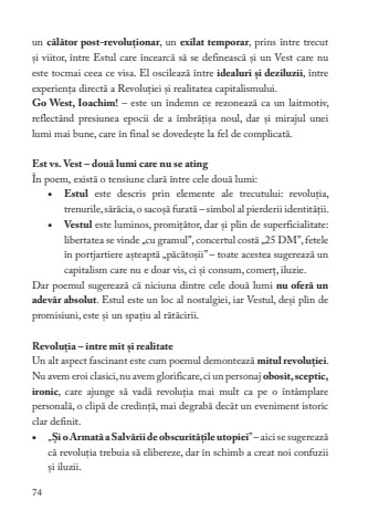 74un c%u0103l%u0103tor post-revolu%u021bionar, un exilat temporar, prins %u00eentre trecut %u0219i viitor, %u00eentre Estul care %u00eencearc%u0103 s%u0103 se defineasc%u0103 %u0219i un Vest care nu este tocmai ceea ce visa. El oscileaz%u0103 %u00eentre idealuri %u0219i deziluzii, %u00eentre experien%u021ba direct%u0103 a Revolu%u021biei %u0219i realitatea capitalismului.Go West, Ioachim! %u2013 este un %u00eendemn ce rezoneaz%u0103 ca un laitmotiv, reflect%u00e2nd presiunea epocii de a %u00eembr%u0103%u021bi%u0219a noul, dar %u0219i mirajul unei lumi mai bune, care %u00een final se dovede%u0219te la fel de complicat%u0103.Est vs. Vest %u2013 dou%u0103 lumi care nu se ating%u00cen poem, exist%u0103 o tensiune clar%u0103 %u00eentre cele dou%u0103 lumi:%u2022Estul este descris prin elemente ale trecutului: revolu%u021bia, trenurile, s%u0103r%u0103cia, o saco%u0219%u0103 furat%u0103 %u2013 simbol al pierderii identit%u0103%u021bii.%u2022Vestul este luminos, promi%u021b%u0103tor, dar %u0219i plin de superficialitate: libertatea se vinde %u201ecu gramul%u201d, concertul cost%u0103 %u201e25 DM%u201d, fetele %u00een portjartiere a%u0219teapt%u0103 %u201ep%u0103c%u0103to%u0219ii%u201d %u2013 toate acestea sugereaz%u0103 un capitalism care nu e doar vis, ci %u0219i consum, comer%u021b, iluzie.Dar poemul sugereaz%u0103 c%u0103 niciuna dintre cele dou%u0103 lumi nu ofer%u0103 un adev%u0103r absolut. Estul este un loc al nostalgiei, iar Vestul, de%u0219i plin de promisiuni, este %u0219i un spa%u021biu al r%u0103t%u0103cirii.Revolu%u021bia %u2013 %u00eentre mit %u0219i realitateUn alt aspect fascinant este cum poemul demonteaz%u0103 mitul revolu%u021bieiNu avem eroi clasici, nu avem glorificare, ci un personaj obosit, sceptic, ironic, care ajunge s%u0103 vad%u0103 revolu%u021bia mai mult ca pe o %u00eent%u00e2mplare personal%u0103, o clip%u0103 de credin%u021b%u0103, mai degrab%u0103 dec%u00e2t un eveniment istoric clar definit.%u2022%u201e%u0218i o Armat%u0103 a Salv%u0103rii de obscurit%u0103%u021bile utopiei%u201d %u2013 aici se sugereaz%u0103 c%u0103 revolu%u021bia trebuia s%u0103 elibereze, dar %u00een schimb a creat noi confuzii %u0219i iluzii.