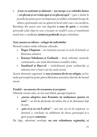 %u2022%u201eListe cu omisiuni %u0219i adausuri %u2013 a%u0219a %u00eencepe a se schimba lumea %u2013 cei pleca%u021bi %u0219i cei veni%u021bi apoi %u0219i cei pleca%u021bi apoi%u201d %u2013 pare o aluzie la jocurile de putere post-revolu%u021bionare, la tr%u0103d%u0103ri, schimb%u0103ri bru%u0219te de tabere, oportuni%u0219tii care au ap%u0103rut %u00een locul celor care s-au sacrificat.Revolu%u021bia din poem este mai degrab%u0103 o stare de spirit, o revela%u021bie personal%u0103 (%u201edin clipa %u00een care a %u00eenceput s%u0103 cread%u0103%u201d), ceea ce transform%u0103 textul %u00eentr-o medita%u021bie intim%u0103 %u0219i profund%u0103 despre schimbare.Arta, muzica %u0219i cultura %u2013 refugii ale individuluiPoemul con%u021bine multe referin%u021be culturale:%u2022Roger Chapman %u2013 un muzician asociat cu rock-ul britanic %u0219i libertatea artistic%u0103.%u2022Katsuya Yokohama %u0219i Garbarek %u2013 dou%u0103 referin%u021be muzicale contrastante, care arat%u0103 diversitatea emo%u021biilor tr%u0103ite.%u2022Saxofonul %u0219i blues-ul %u2013 simbolizeaz%u0103 poate melancolia %u0219i r%u0103t%u0103cirea %u00eentr-o lume care %u00ee%u0219i caut%u0103 sensul.Aceste elemente sugereaz%u0103 c%u0103 arta %u0219i muzica devin un refugiuunde personajul %u00ee%u0219i poate p%u0103stra libertatea autentic%u0103, dincolo de haosul istoric.Finalul %u2013 un amestec de resemnare %u0219i acceptareUltimele versuri aduc un ton mai bl%u00e2nd, aproape %u00eemp%u0103cat:%u2022%u201emereu adoptiva mea Rom%u00e2nie %u00ee%u021bi mul%u021bumesc pentru c%u0103 exist%u201d %u2013 un fel de declara%u021bie de iubire, dar %u0219i de distan%u021bare fa%u021b%u0103 de %u021bar%u0103.%u2022%u201e%u0219tiu c%u0103 %u0219i eu voi fi salvat%u201d %u2013 aici este un soi de %u00eemp%u0103care cu destinul, o concluzie c%u0103, indiferent de drum, personajul %u0219i-a g%u0103sit propria m%u00e2ntuire.De fapt, adev%u0103rata revolu%u021bie nu este schimbarea regimului, ci