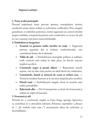 St%u0103p%u00e2nul realit%u0103%u021bii1. Teme %u0219i idei principalePoemul exploreaz%u0103 teme precum puterea, manipularea istoriei, sacrificiul uman, iluzia ordinii %u0219i ciclicitatea conflictelor. Prin imagini grandioase %u0219i simboluri puternice, textul sugereaz%u0103 un control absolut asupra realit%u0103%u021bii, compar%u00e2nd puterea unui conduc%u0103tor cu un joc de %u0219ah %u00een care oamenii sunt piese interschimbabile.2. Simbolism %u0219i imagistic%u0103%u2022Scaunul cu picioare %u00eenalte %u00eenvelite %u00een cea%u021b%u0103 %u2192 Sugereaz%u0103 puterea suprem%u0103, dar %u0219i izolarea conduc%u0103torului, care controleaz%u0103 lumea de la distan%u021b%u0103.%u2022Tabla de %u0219ah %u2192 Simbolizeaz%u0103 strategiile politice %u0219i militare, unde oamenii sunt redu%u0219i la ni%u0219te piese, iar fiecare mi%u0219care implic%u0103 sacrificii.%u2022Costumele negre %u0219i pionii ofi%u021beri%u2192supuse, care %u00ee%u0219i dau via%u021ba pentru un ideal dictat de conduc%u0103tor.%u2022Lum%u00e2n%u0103rile, fumul %u0219i mirosul de cear%u0103 %u0219i ierburi arseTrimit la ritualuri funerare %u0219i la trecerea timpului prin sacrificii.%u2022D%u00e2rele ro%u0219ii%u2192 Simbolizeaz%u0103 s%u00e2ngele v%u0103rsat %u00een numele unei ordini prestabilite.%u2022Balerinele albe%u2192 Pot fi interpretate ca iluzii ale frumuse%u021bii %u0219i ordinii %u00een mijlocul haosului.3. Structur%u0103 %u0219i stilPoemul are o construc%u021bie ampl%u0103, cu fraze lungi, aproape hipnotice, ce contribuie la o atmosfer%u0103 solemn%u0103. Folosirea repeti%u021biilor (%u201eAtunci el...%u201d, %u201e%u0218i vorbele celui care...%u201d) accentueaz%u0103 ideea de ciclicitate %u0219i inevitabilitate.