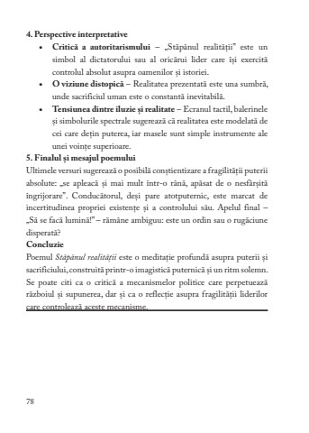 784. Perspective interpretative%u2022Critic%u0103 a autoritarismului %u2013 %u201eSt%u0103p%u00e2nul realit%u0103%u021bii%u201d este un simbol al dictatorului sau al oric%u0103rui lider care %u00ee%u0219i exercit%u0103 controlul absolut asupra oamenilor %u0219i istoriei.%u2022O viziune distopic%u0103 %u2013 Realitatea prezentat%u0103 este una sumbr%u0103, unde sacrificiul uman este o constant%u0103 inevitabil%u0103.%u2022Tensiunea dintre iluzie %u0219i realitate %u2013 Ecranul tactil, balerinele %u0219i simbolurile spectrale sugereaz%u0103 c%u0103 realitatea este modelat%u0103 de cei care de%u021bin puterea, iar masele sunt simple instrumente ale unei voin%u021be superioare.5. Finalul %u0219i mesajul poemuluiUltimele versuri sugereaz%u0103 o posibil%u0103 con%u0219tientizare a fragilit%u0103%u021bii puterii absolute: %u201ese apleac%u0103 %u0219i mai mult %u00eentr-o r%u00e2n%u0103, ap%u0103sat de o nesf%u00e2r%u0219it%u0103 %u00eengrijorare%u201d. Conduc%u0103torul, de%u0219i pare atotputernic, este marcat de incertitudinea propriei existen%u021be %u0219i a controlului s%u0103u. Apelul final %u2013 %u201eS%u0103 se fac%u0103 lumin%u0103!%u201d %u2013 r%u0103m%u00e2ne ambiguu: este un ordin sau o rug%u0103ciune disperat%u0103?ConcluziePoemul St%u0103p%u00e2nul realit%u0103%u021bii este o medita%u021bie profund%u0103 asupra puterii %u0219i sacrificiului, construit%u0103 printr-o imagistic%u0103 puternic%u0103 %u0219i un ritm solemn. Se poate citi ca o critic%u0103 a mecanismelor politice care perpetueaz%u0103 r%u0103zboiul %u0219i supunerea, dar %u0219i ca o reflec%u021bie asupra fragilit%u0103%u021bii liderilor care controleaz%u0103 aceste mecanisme.