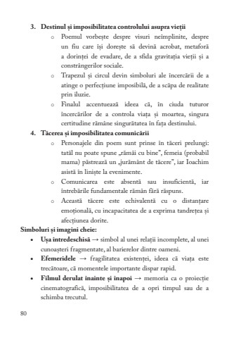 803.Destinul %u0219i imposibilitatea controlului asupra vie%u021biioPoemul vorbe%u0219te despre visuri ne%u00eemplinite, despre un fiu care %u00ee%u0219i dore%u0219te s%u0103 devin%u0103 acrobat, metafor%u0103 a dorin%u021bei de evadare, de a sfida gravita%u021bia vie%u021bii %u0219i a constr%u00e2ngerilor sociale.oTrapezul %u0219i circul devin simboluri ale %u00eencerc%u0103rii de a atinge o perfec%u021biune imposibil%u0103, de a sc%u0103pa de realitate prin iluzie.oFinalul accentueaz%u0103 ideea c%u0103, %u00een ciuda tuturor %u00eencerc%u0103rilor de a controla via%u021ba %u0219i moartea, singura certitudine r%u0103m%u00e2ne singur%u0103tatea %u00een fa%u021ba destinului.4.T%u0103cerea %u0219i imposibilitatea comunic%u0103riioPersonajele din poem sunt prinse %u00een t%u0103ceri prelungi: tat%u0103l nu poate spune %u201er%u0103m%u00e2i cu bine%u201d, femeia (probabil mama) p%u0103streaz%u0103 un %u201ejur%u0103m%u00e2nt de t%u0103cere%u201d, iar Ioachim asist%u0103 %u00een lini%u0219te la evenimente.oComunicarea este absent%u0103 sau insuficient%u0103, iar %u00eentreb%u0103rile fundamentale r%u0103m%u00e2n f%u0103r%u0103 r%u0103spuns.oAceast%u0103 t%u0103cere este echivalent%u0103 cu o distan%u021bare emo%u021bional%u0103, cu incapacitatea de a exprima tandre%u021bea %u0219i afec%u021biunea dorite.Simboluri %u0219i imagini cheie:%u2022U%u0219a %u00eentredeschis%u0103%u2192 simbol al unei rela%u021bii incomplete, al unei cunoa%u0219teri fragmentate, al barierelor dintre oameni.%u2022Efemeridele%u2192 fragilitatea existen%u021bei, ideea c%u0103 via%u021ba este trec%u0103toare, c%u0103 momentele importante dispar rapid.%u2022Filmul derulat %u00eenainte %u0219i %u00eenapoi%u2192 memoria ca o proiec%u021bie cinematografic%u0103, imposibilitatea de a opri timpul sau de a schimba trecutul.