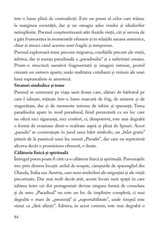 84%u00eentr-o lume plin%u0103 de contradic%u021bii. Este un poem al celor care tr%u0103iesc la marginea societ%u0103%u021bii, dar %u0219i un omagiu adus visului %u0219i idealurilor ne%u00eemplinite. Poemul con%u0219tientizeaz%u0103 at%u00e2t iluziile vie%u021bii, c%u00e2t %u0219i nevoia de a g%u0103si frumuse%u021bea %u00een momentele efemere %u0219i %u00een rela%u021biile umane autentice, chiar %u0219i atunci c%u00e2nd acestea sunt fragile %u0219i temporare.Poemul exploreaz%u0103 teme precum migrarea, condi%u021biile precare ale vie%u021bii, iubirea, dar %u0219i esen%u021ba paradoxal%u0103 a %u201eparadisului%u201d %u0219i a suferin%u021bei umane. Printr-o structur%u0103 narativ%u0103 fragmentat%u0103 %u0219i imagini intense, poetul creeaz%u0103 un univers aparte, unde realitatea cotidian%u0103 %u0219i viziuni ale unei lumi suprarealiste se amestec%u0103.Straturi simbolice %u0219i temePoemul se centreaz%u0103 pe via%u021ba unei femei care, al%u0103turi de b%u0103rbatul pe care-l iube%u0219te, tr%u0103ie%u0219te %u00eentr-o lume marcat%u0103 de frig, de mizerie %u0219i de singur%u0103tate, dar %u0219i de momente intense de iubire %u0219i speran%u021b%u0103. Tema paradisului apare %u00een mod paradoxal, fiind prezentat%u0103 ca un loc care nu ofer%u0103 nici siguran%u021b%u0103, nici confort, ci, dimpotriv%u0103, este mai degrab%u0103 o form%u0103 de evaziune dintr-o realitate aspr%u0103 %u0219i plin%u0103 de lipsuri. Acest %u201eparadis%u201d se construie%u0219te %u00een jurul unui bilet simbolic, un %u201ebilet gratis%u201d primit de la paznicul unui loc numit %u201eParadis%u201d, dar care nu reprezint%u0103 altceva dec%u00e2t o promisiune efemer%u0103, o iluzie.C%u0103l%u0103toria fizic%u0103 %u0219i spiritual%u0103%u00centregul poem poate fi citit ca o c%u0103l%u0103torie fizic%u0103 %u0219i spiritual%u0103. Personajele trec prin diverse loca%u021bii: azilul de noapte, c%u00e2mpurile de sparanghel din Olanda, Italia sau Austria, care sunt simboluri ale migra%u021biei %u0219i ale vie%u021bii precarizate. Dar mai mult dec%u00e2t at%u00e2t, aceste locuri sunt spa%u021bii %u00een care iubirea %u00eentre cei doi protagoni%u0219ti devine singura form%u0103 de consolare %u0219i de sens. %u201eParadisul%u201d nu este un loc de %u00eemplinire complet%u0103, ci mai degrab%u0103 o stare de %u201eprezen%u021b%u0103%u201d %u0219i %u201esuportabilitate%u201d, unde timpul este v%u0103zut ca %u201ef%u0103r%u0103 sf%u00e2r%u0219it%u201d. Iubirea, %u00een acest context, este mai degrab%u0103 o