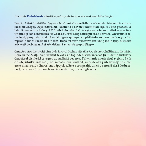 grele și mai solide din regiunea Speyside. Este o compoziție unică de aromă clară de dulce-
